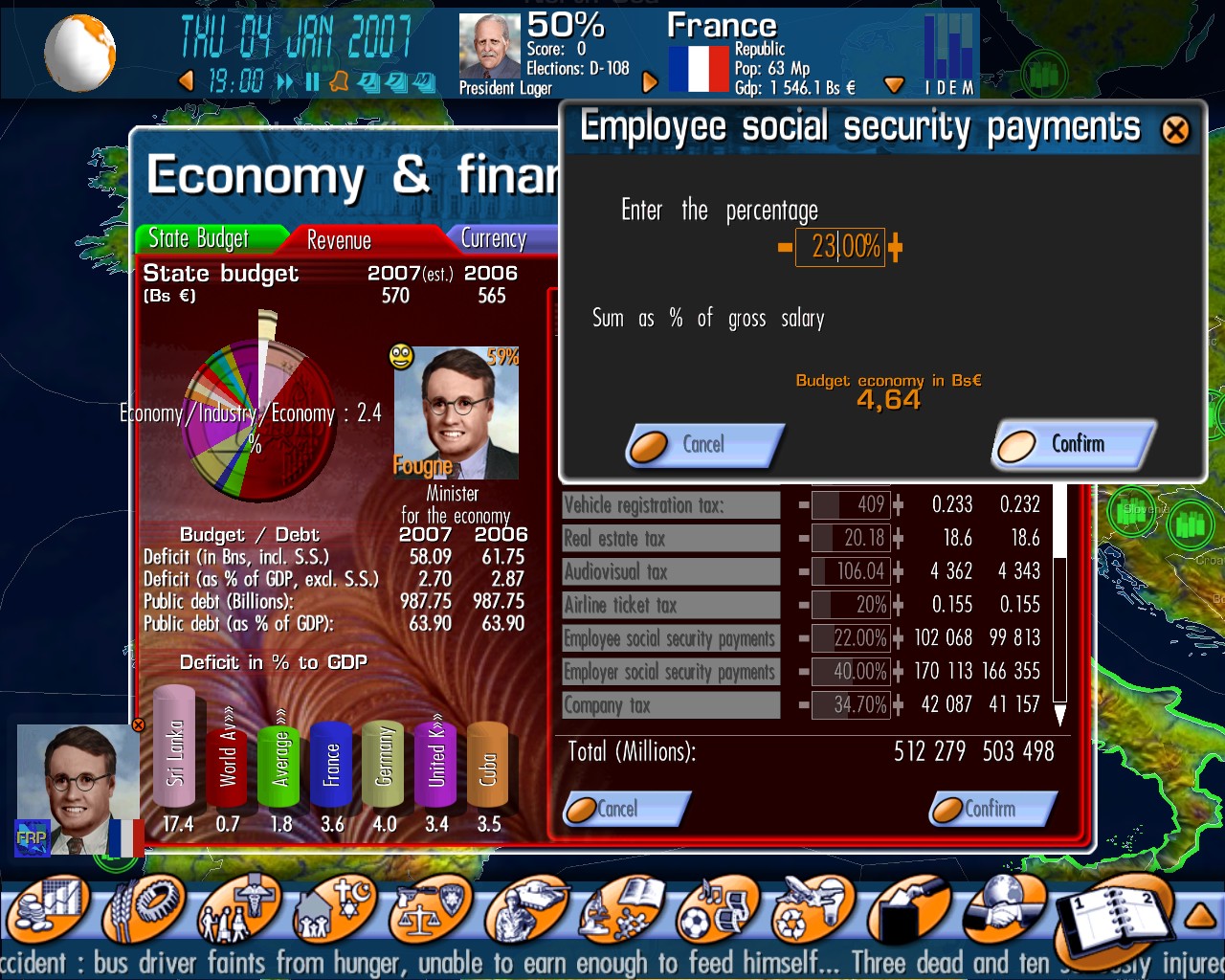 Over 150 economic sectors are featured along with their production and consumption rules (costs, raw materials, transport costs, workforce qualification, productivity...). Also included are over 100 scientific discoveries and technological advances imagined for the next 50 years to come (aids vaccine, anti-sleep molecule digital paper, optical textiles, nanorobots, holographic TV...).